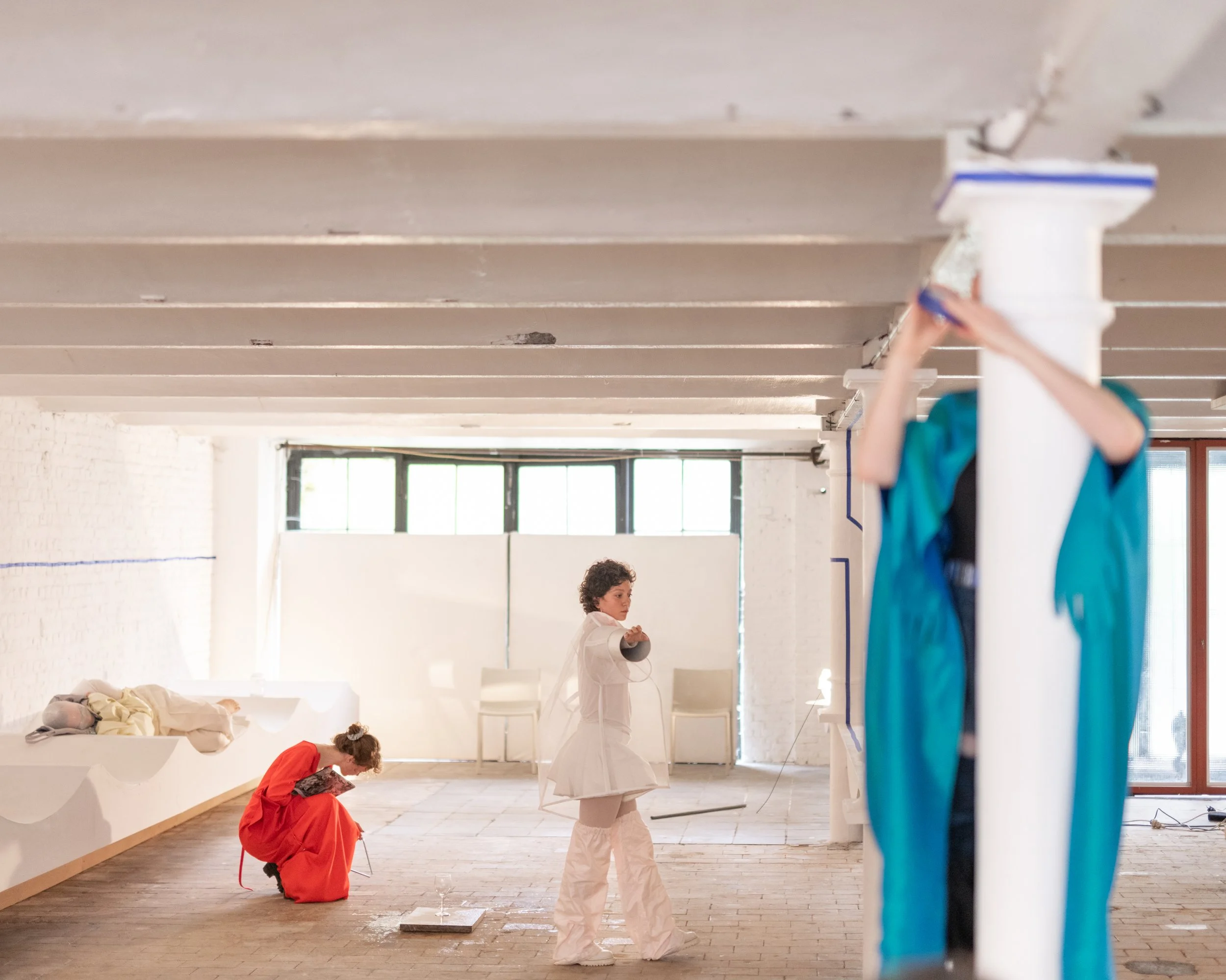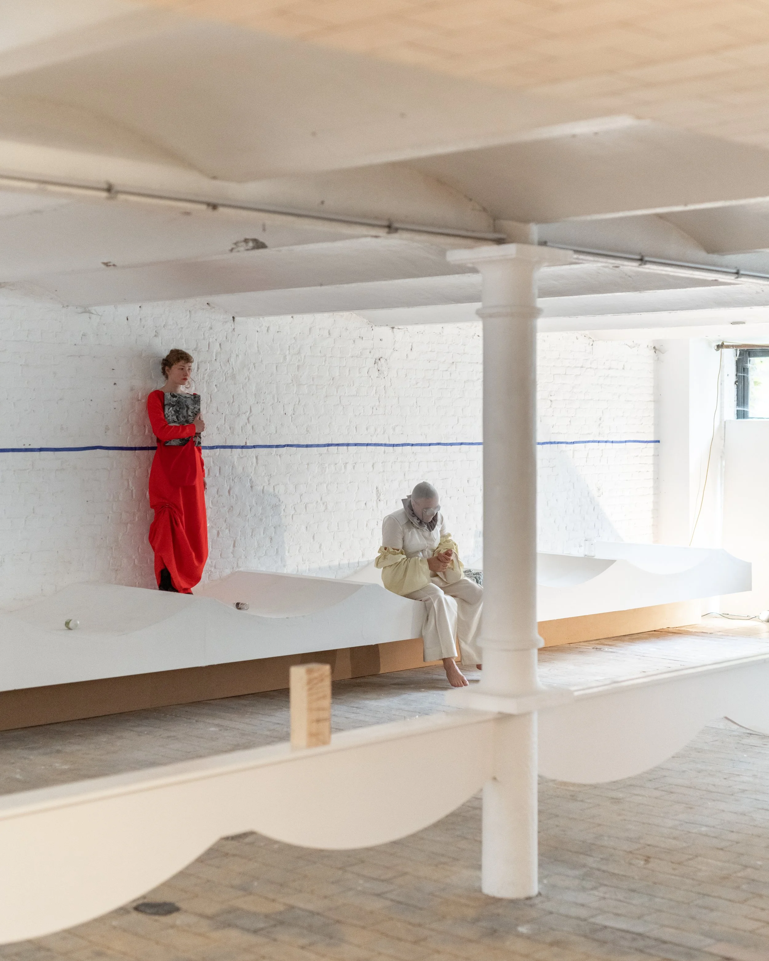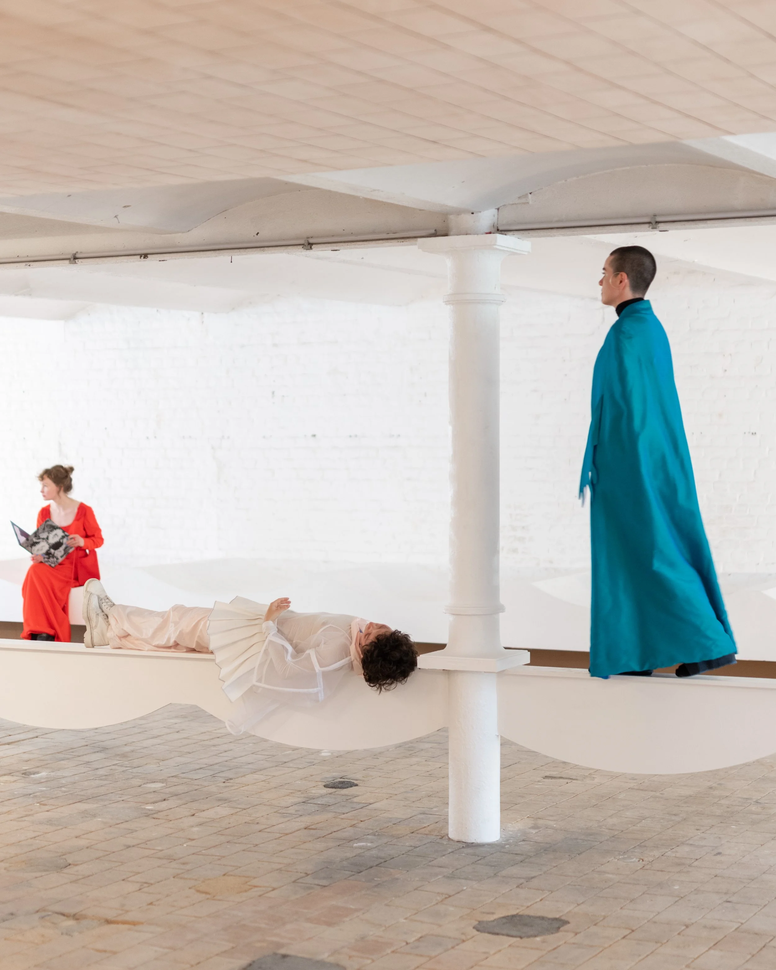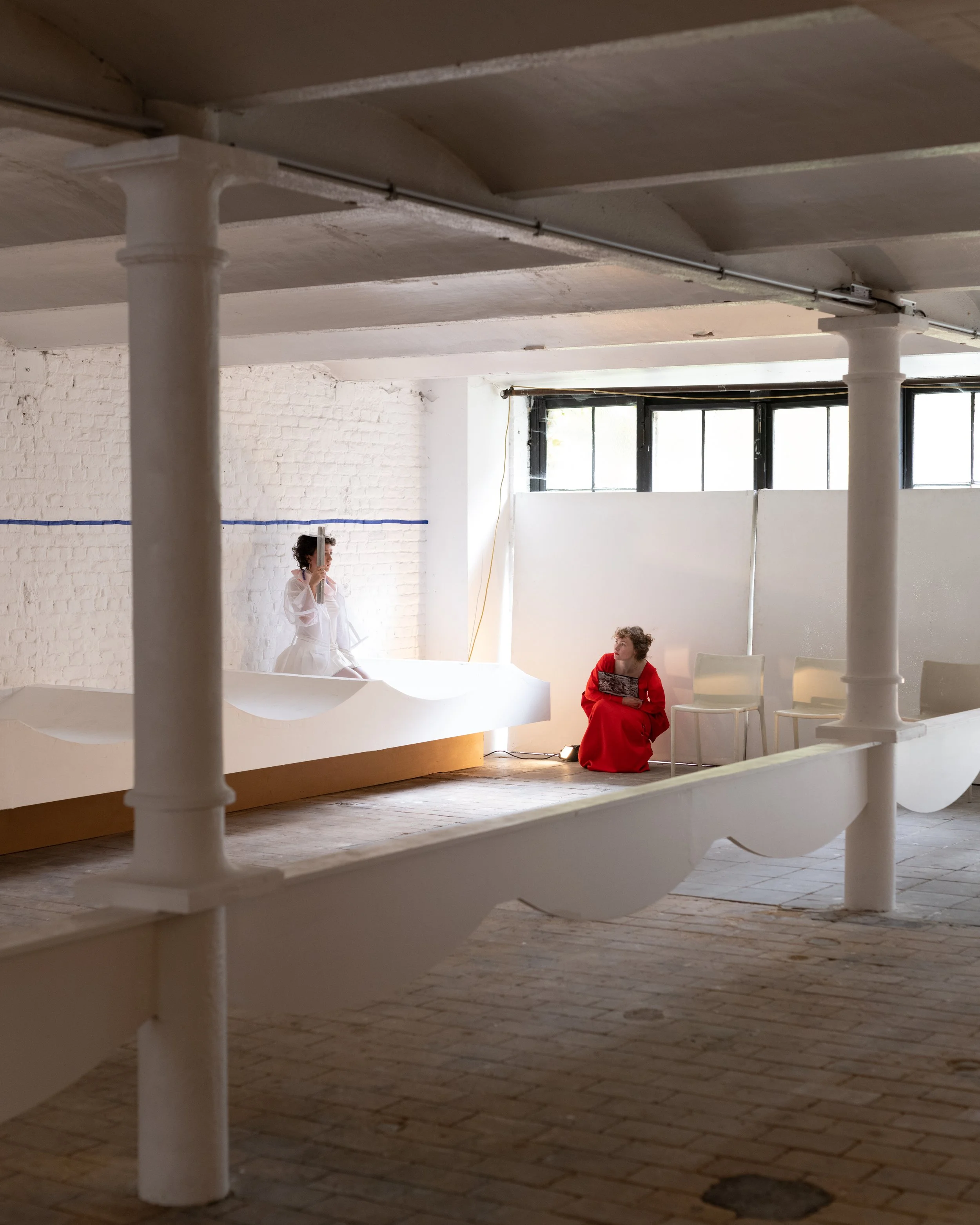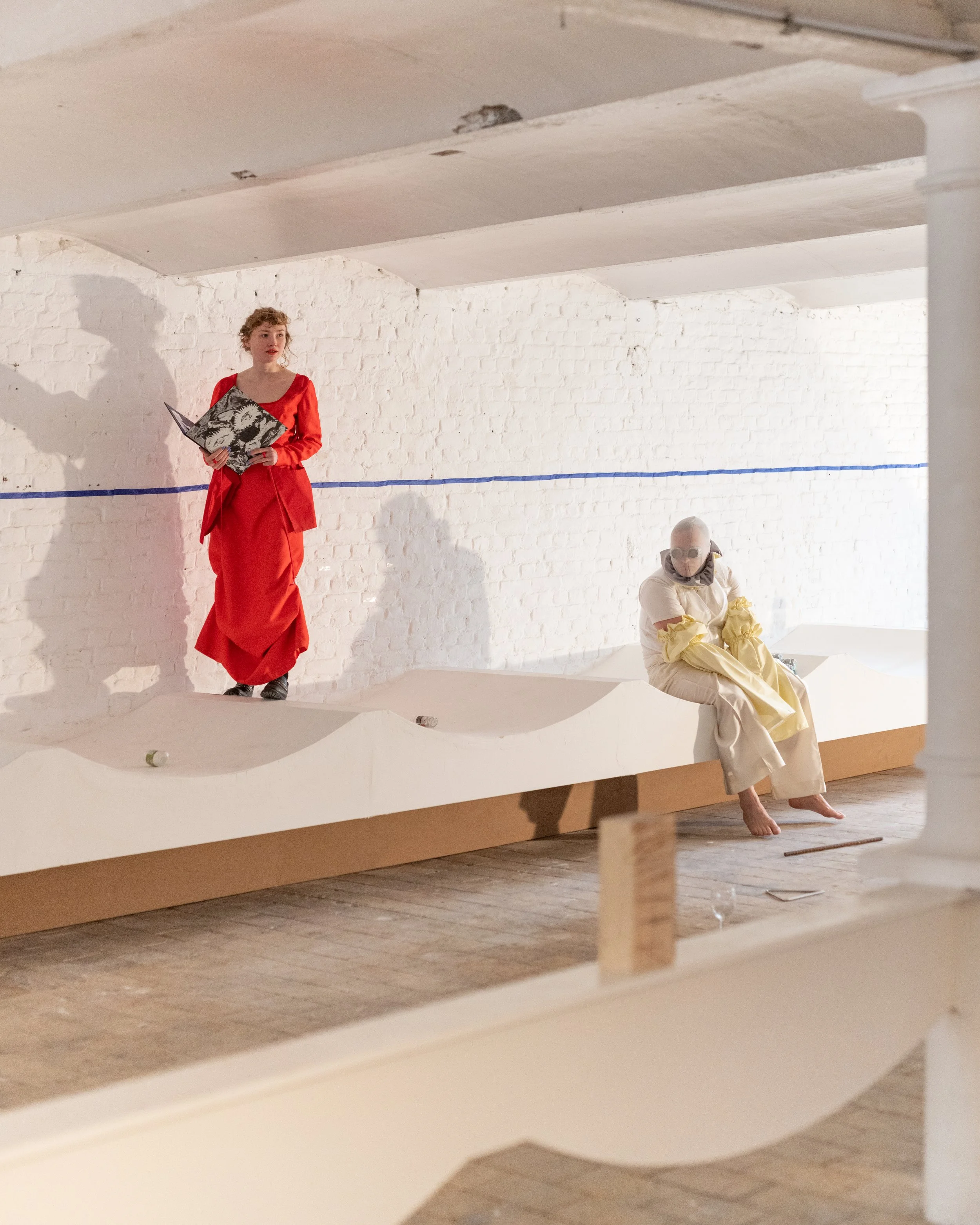 The performance is a part-improvised, part-rehearsed activation of the characters within the physical and conceptual space of the set, presented over a 90-minute period at L’Escaut for the Art Brussels OFF Programme on 28 April 2024.
